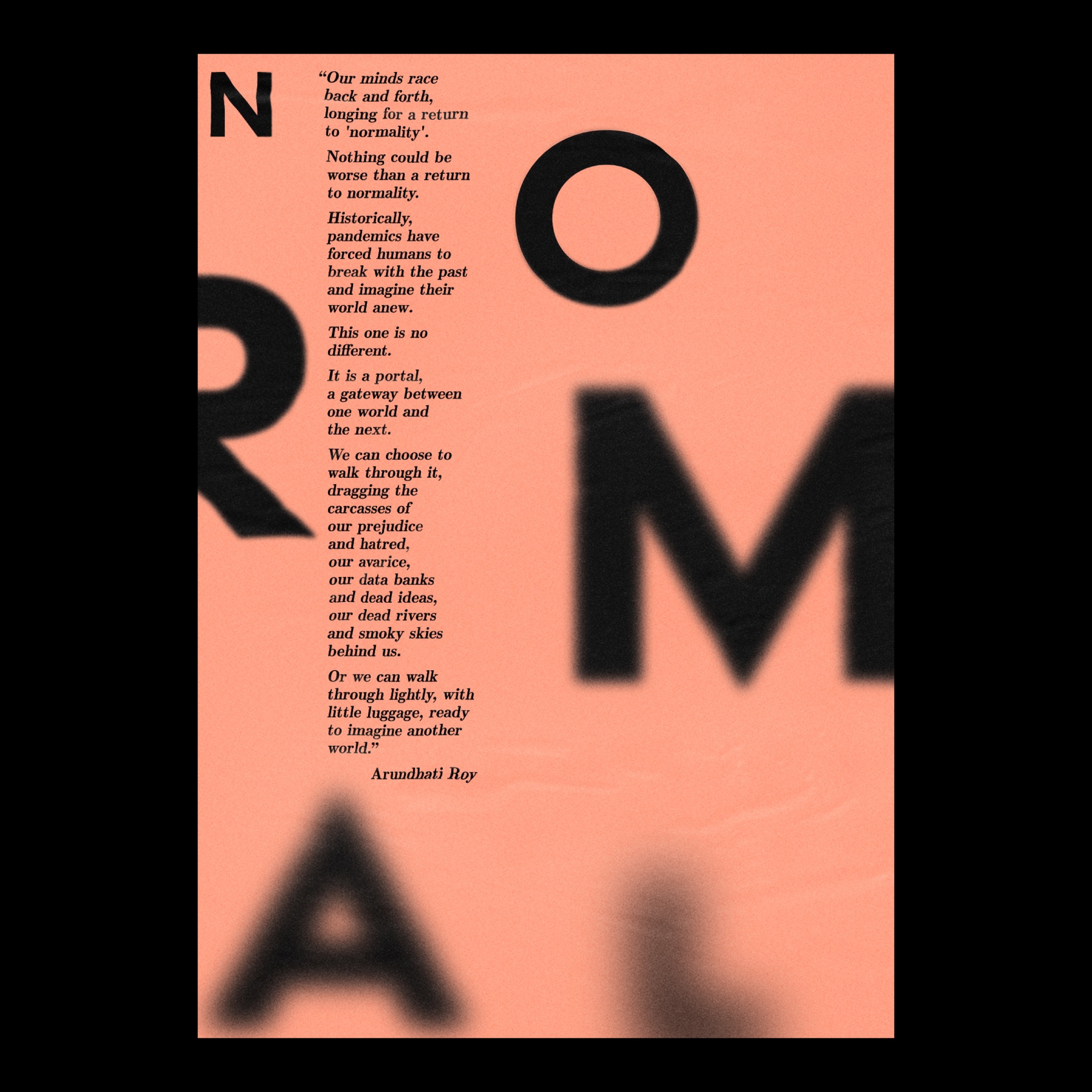 I decided to start with Photoshop, then move to Illustrator. Of the two I guessed that Photoshop might be easier to grapple with first. At first it was thrilling, finally getting round to learning a skill I'd wanted for ages, and being amazed anew every hour at the latest dazzling feature. Of course, that novelty soon wore off and the dryness of the 40+ hour LinkedIn course was starting to take its toll. We trudged on, and made it through the 'Beginner' course. Should I go for another 40 and learn the 'Advanced', or is it time for a project? Amongst the many creatives and designers I followed on Instagram, there seemed to be a few Lockdown poster competitions doing the rounds. What better opportunity to put my new found skills to the test. I used a passage from Indian author Arundhati Roy that I found particularly arresting, and built a poster around that.
