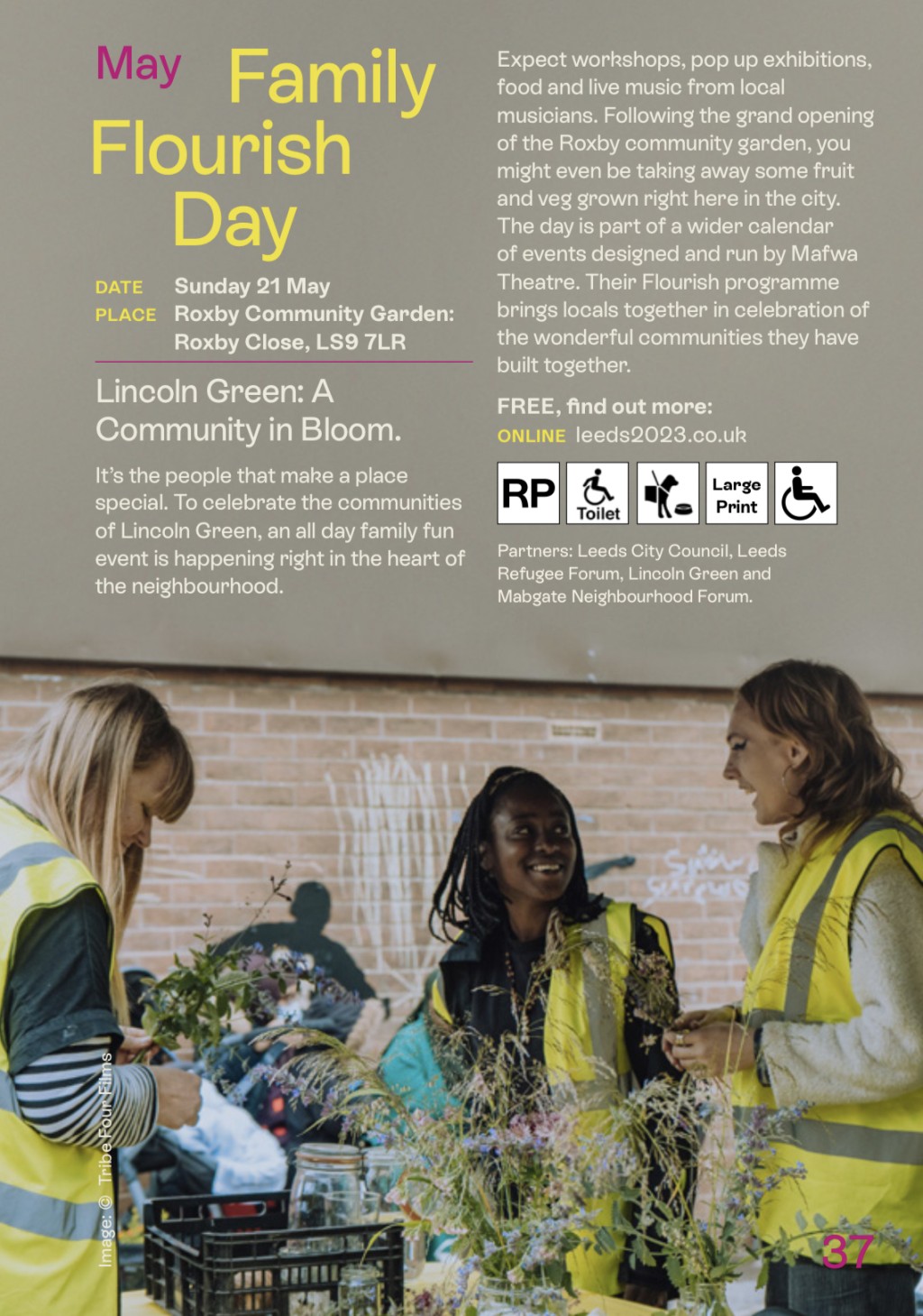The Family Flourish Day was commissioned by Leeds 2023 as part of 'My Word, My City, My Neighbourhood' and was held in partnership with Leeds City Council and Lincoln Green and Mabgate Neighbourhood Fund.